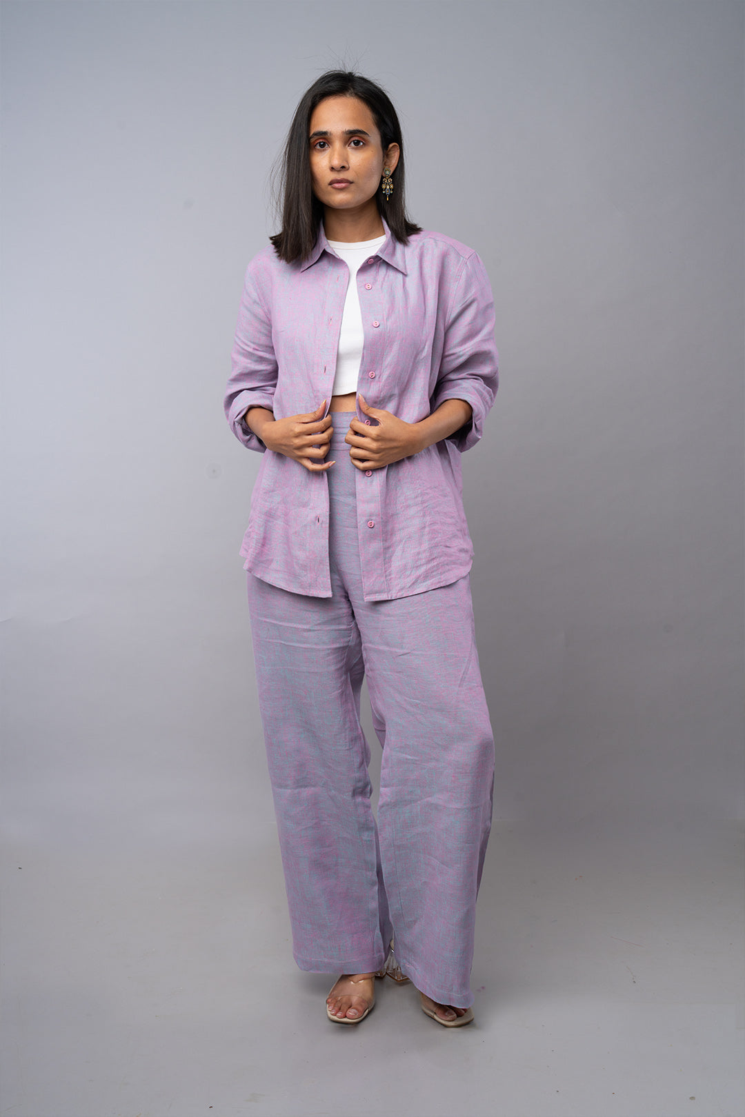 The Arlo Shirt is designed with clean minimalist lines and soft structure, while the Sora Pants feature a relaxed wide-leg shape and comfortable waist for fluid movement throughout the day.