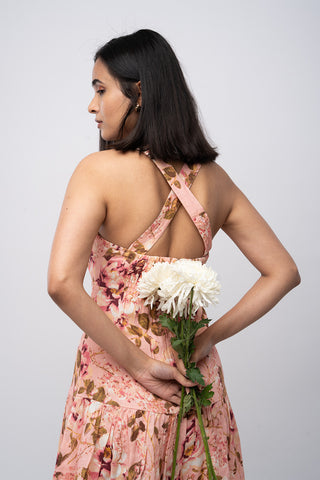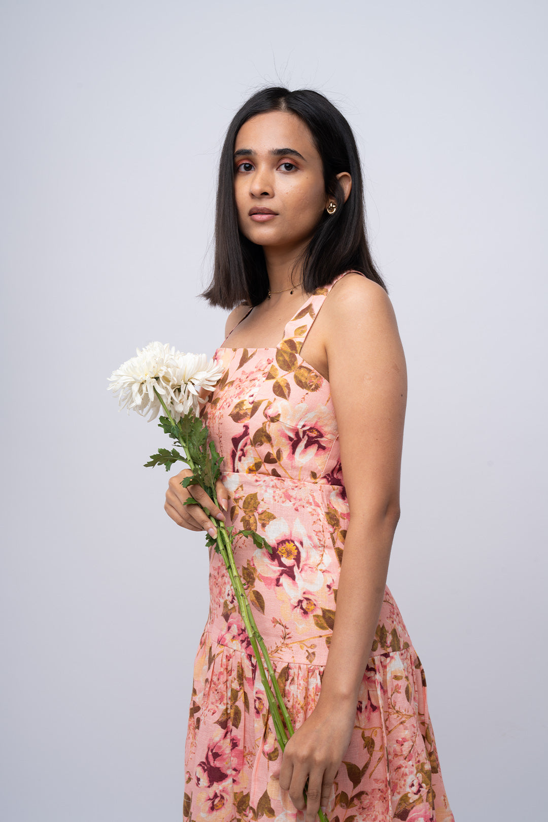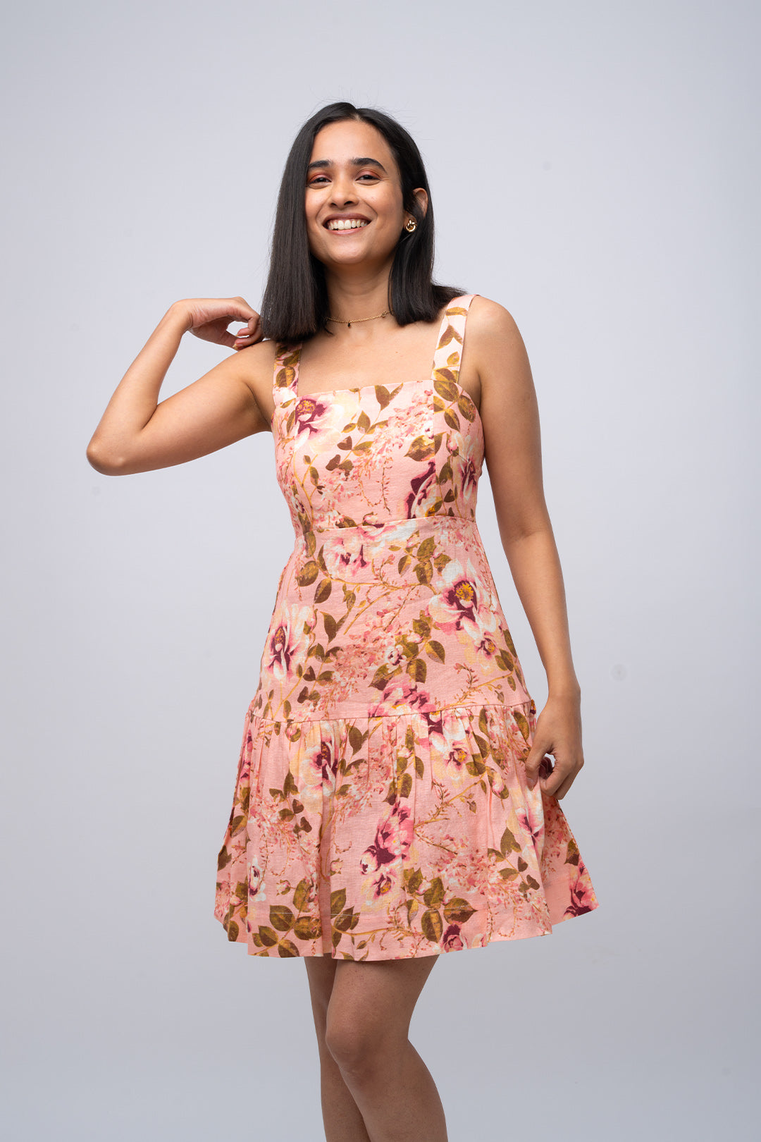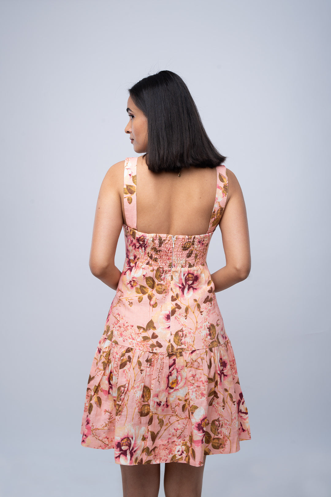 A soft floral linen dress with a structured bodice and versatile 2-way styling, finished with an easy, flared silhouette.