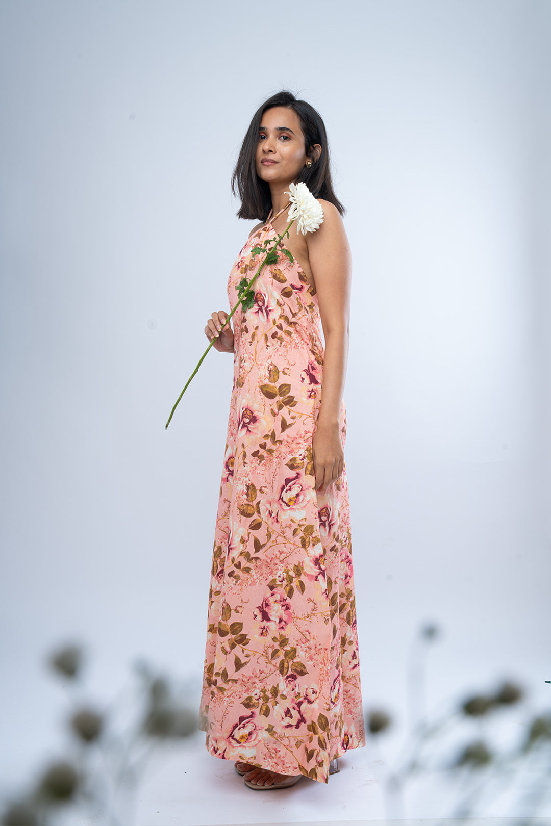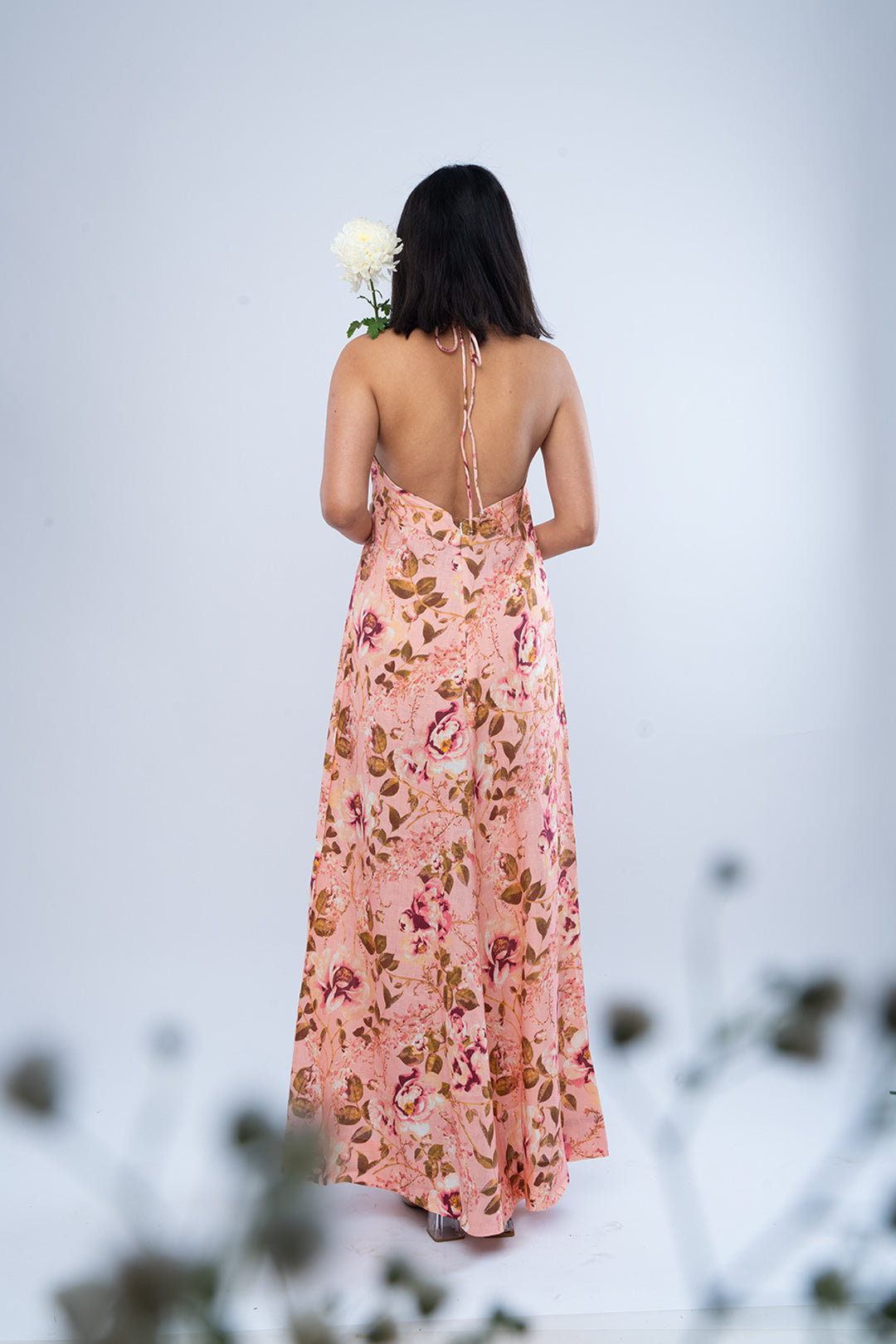 The halter neckline and open back create a long, fluid line, while the soft drape allows the fabric to move naturally. Understated yet expressive, it holds a quiet presence.